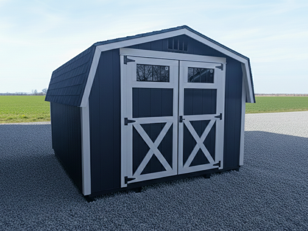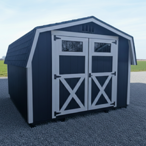 Finished in a sleek black exterior with soft-toned trim, this barn-style shed makes a beautiful statement in any backyard. Transom windows in the doors add a touch of light and charm and the 2′ loft adds practical storage at eye level.