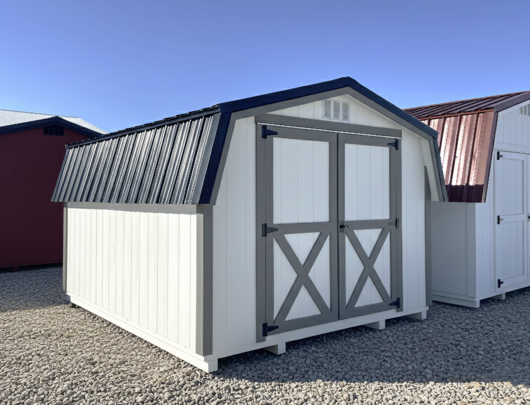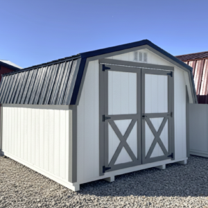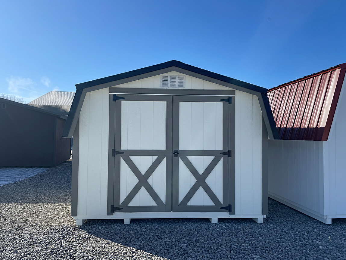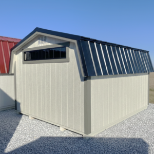 This charming mini barn storage shed blends timeless character with soft, neutral tones that fit perfectly in any back yard. The 6′ transom window adds a touch of character and natural light making it easy to organize and access your belongings without sacrificing wall space or privacy.